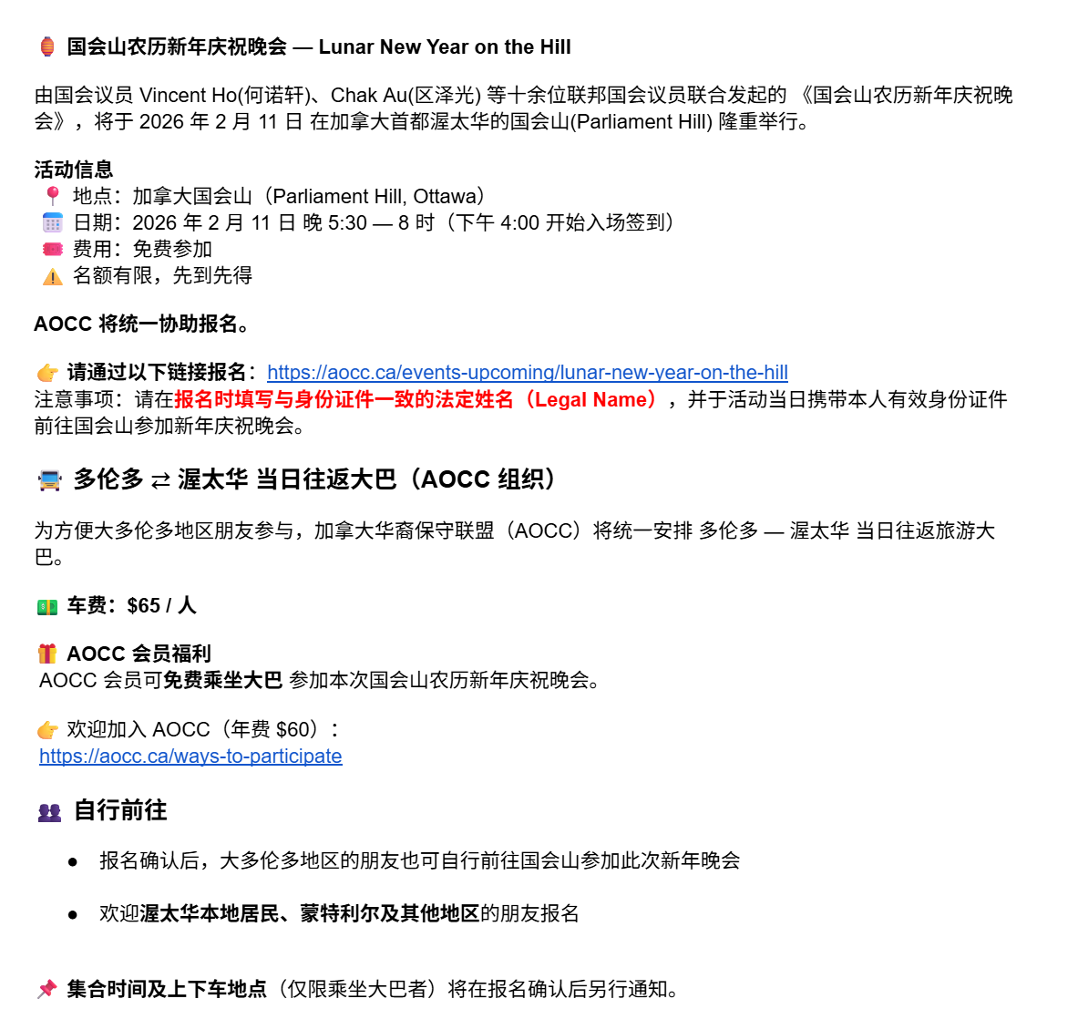 To facilitate participation from the Greater Toronto Area, the Alliance of Chinese Conservatives (AOCC) will arrange a same-day round-trip coach between Toronto and Ottawa.